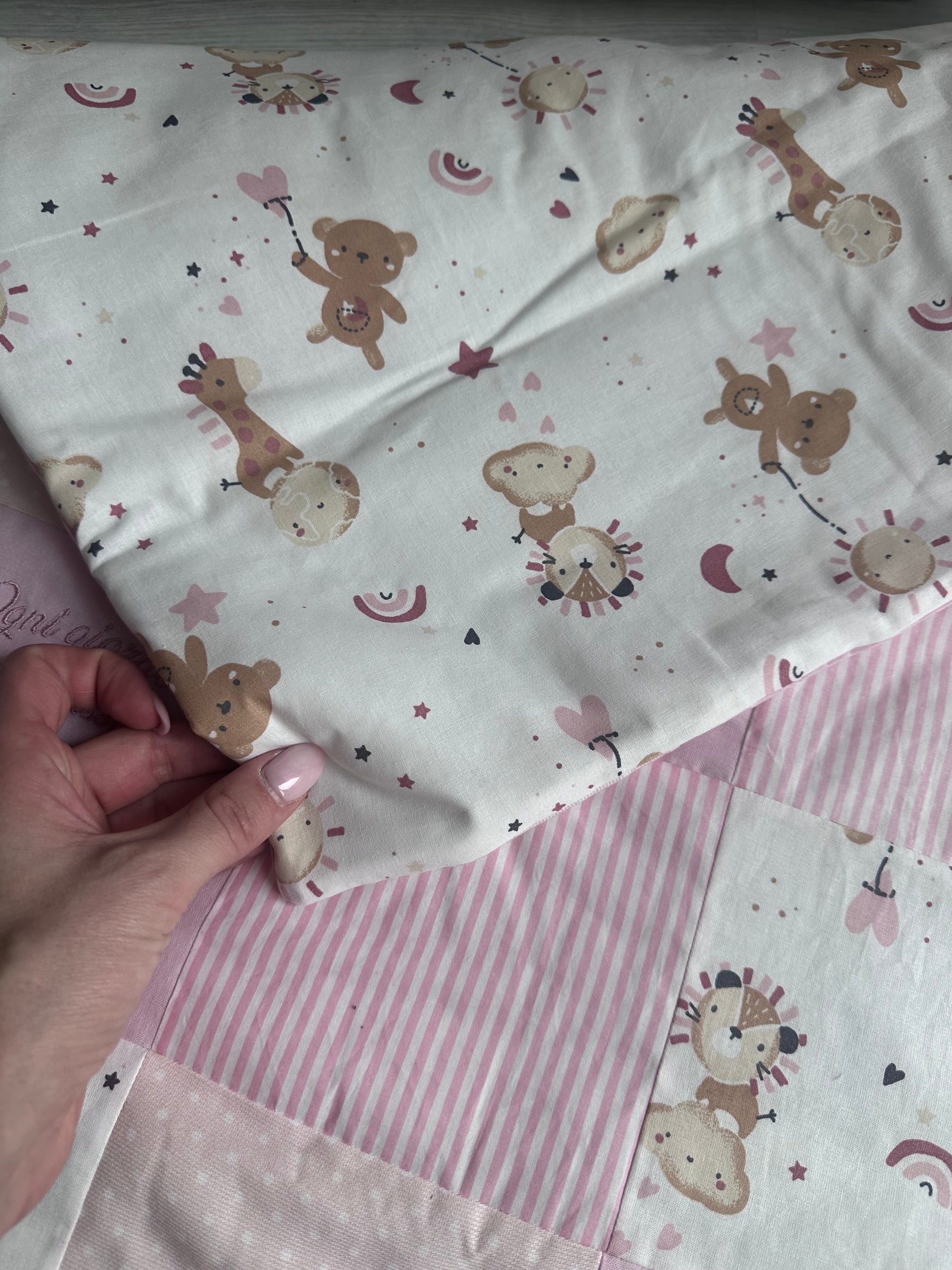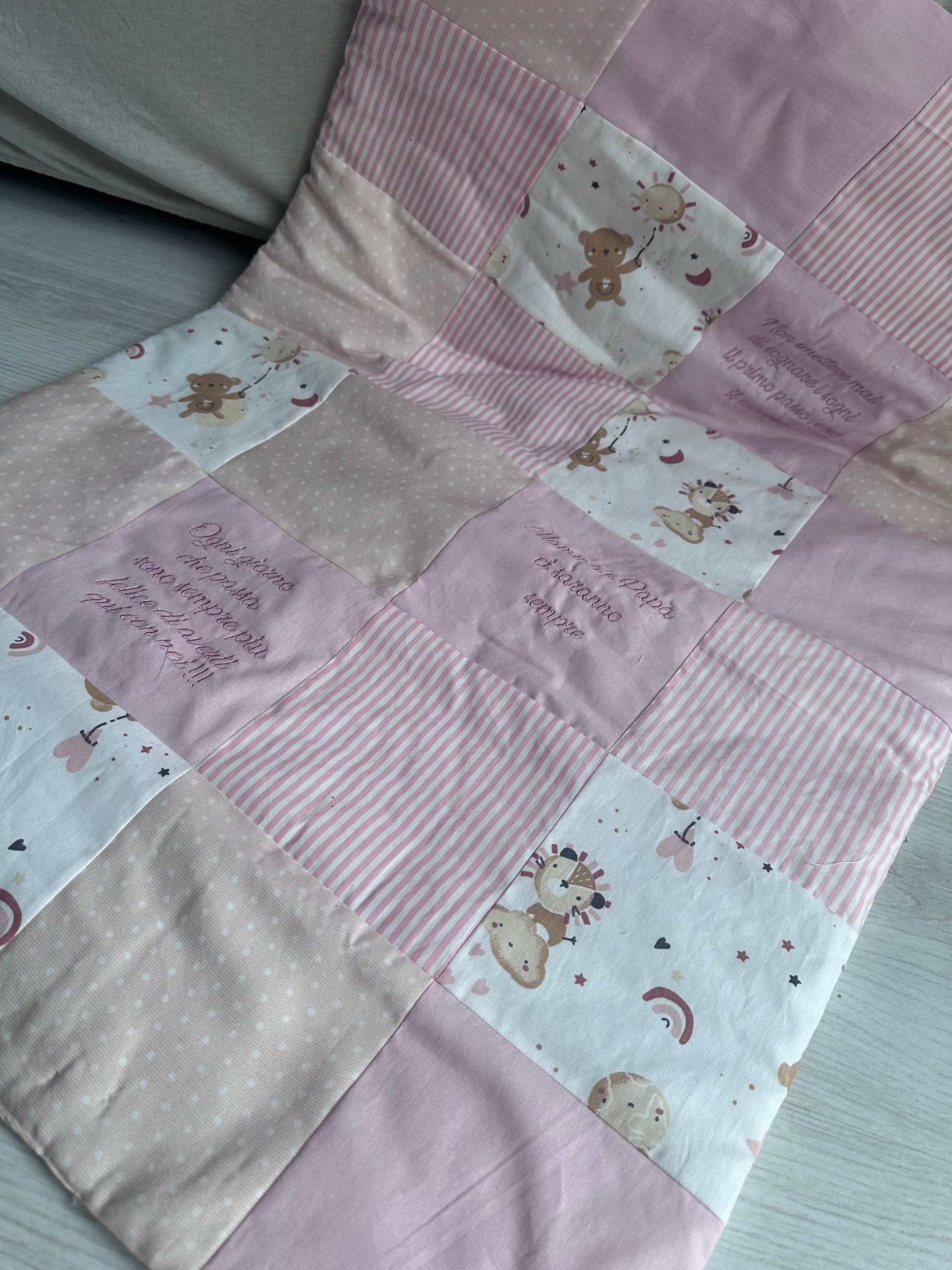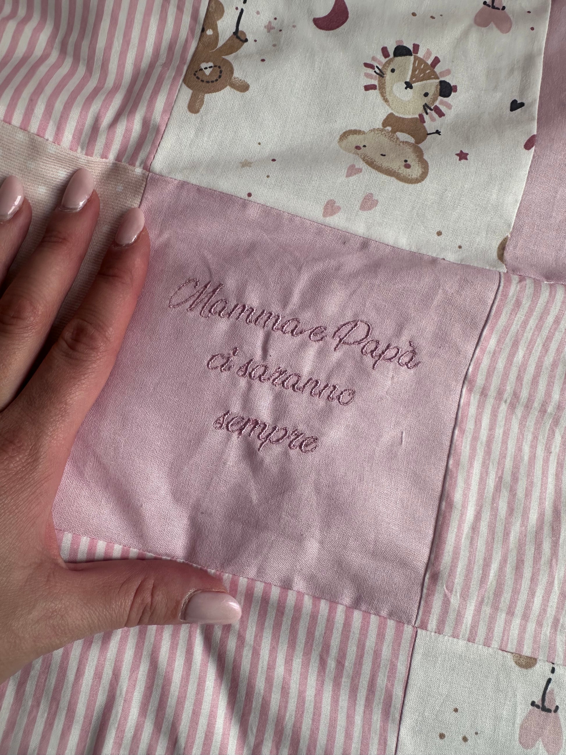 Si usa la tecnica patcwork,sono tantissimi quadretti dove alcuni sono con tessuto fantasia e alcuni con tessuto tinta unita. Ma possono essere utilizzati anche le tutine dei vostri piccoli.